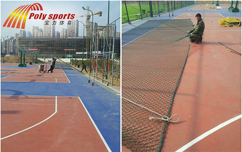 塑胶篮球场施工围网安装包括围网预埋件水平高低测量,围网框架焊接,围网喷漆,扁铁,挂网等工艺。