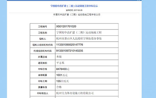 杭州宝力体育设施工程有限公司中标宁围初中运动场地改建工程。