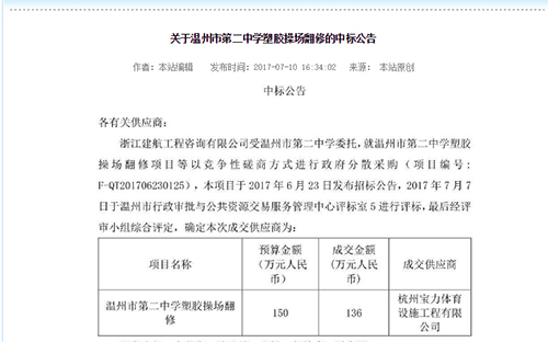 2017年7月10日中标温州市第二中学塑胶操场翻修公告