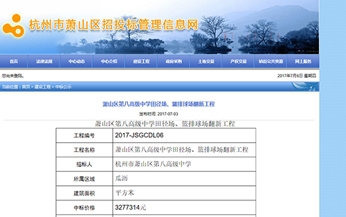 2017年7月3号中标萧山区第八高级中学田径场、篮排球场翻新工程
