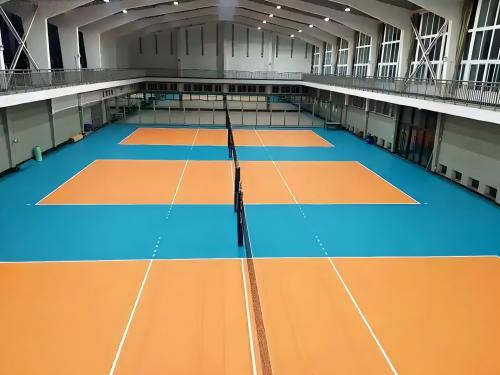 室内排球场地材质选择需平衡性能、成本与维护。木质地板弹性佳、防滑吸音,适合专业比赛但维护高;PVC地板性价比高,耐磨减震易清洁,广用于学校社区;橡胶地板缓冲降噪,适合高保护需求;丙烯酸涂料经济实惠,多用于临时场地;混凝土需配缓冲垫。