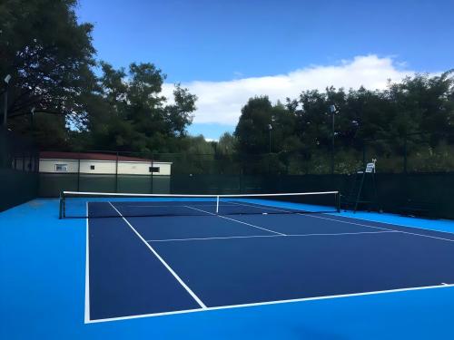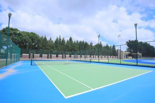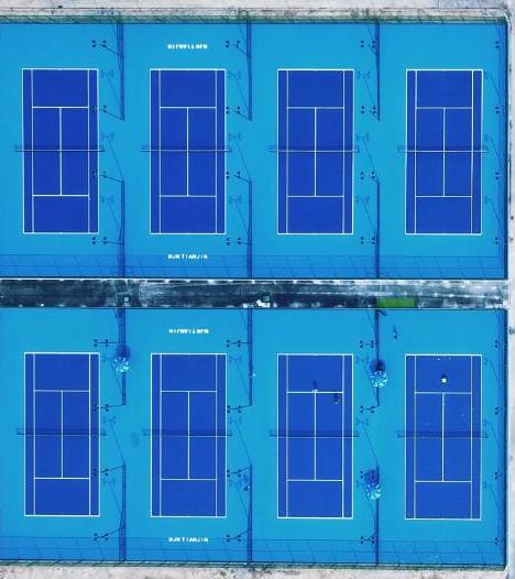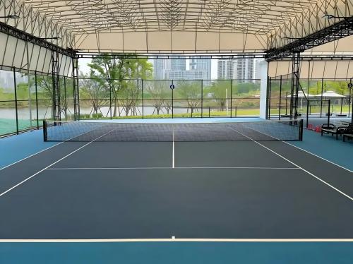 硬地网球场建设需确保地基处理夯实平整,采用混凝土或沥青基层(厚度≥10cm),铺设丙烯酸/硅PU弹性面层,满足国际标准尺寸(23.77×10.97m)。需配置环形排水系统(坡度≥0.5%),划线清晰符合ITF规范,配备围网、灯光等设施。