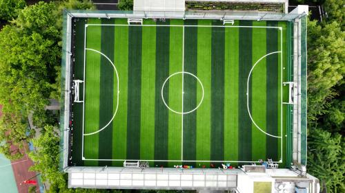 楼顶足球场施工需重点把控承重安全,施工前评估楼顶荷载能力并定期监测;强化防水排水系统,清理伸缩缝沥青并采用专用补缝剂;选用防滑耐磨地面材料,设置围网与防护网片;优化基础坡度与排水设计,并定期维护设施以延长使用寿命。