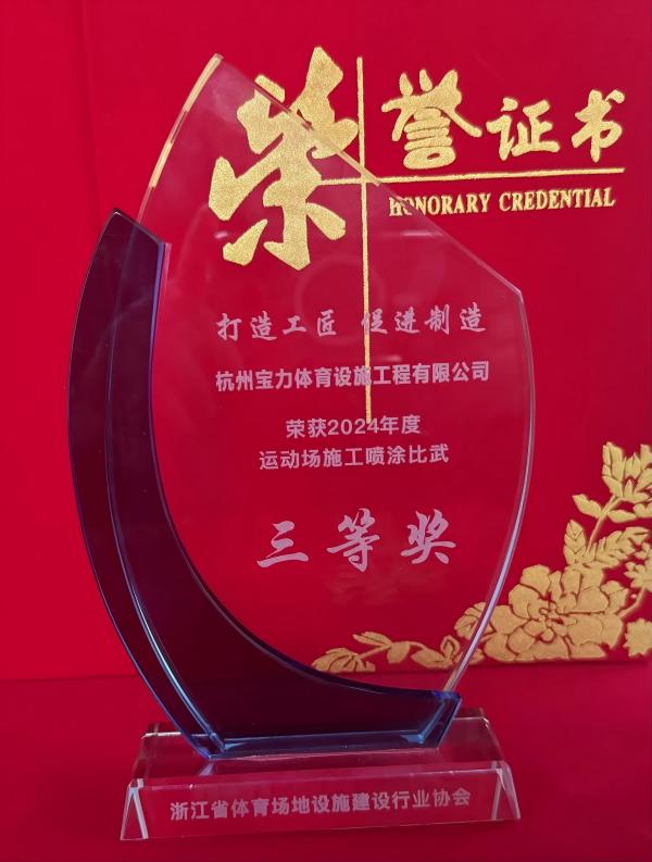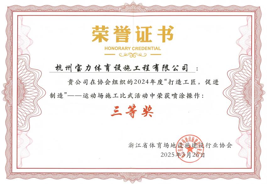2025年3月26日,在浙江省体育场地设施建设行业协会举办的2024年度“打造工匠,促进制造”运动场施工比武活动表彰大会上,杭州宝力体育设施工程有限公司(以下简称“宝力体育”)凭借精湛的施工技术和卓越的团队协作能力,荣获“喷涂操作三等奖”。该奖项不仅充分印证了企业在专业施工领域的核心竞争力,更凸显了宝力体育团队以工匠精神打造精品工程的实践成果。