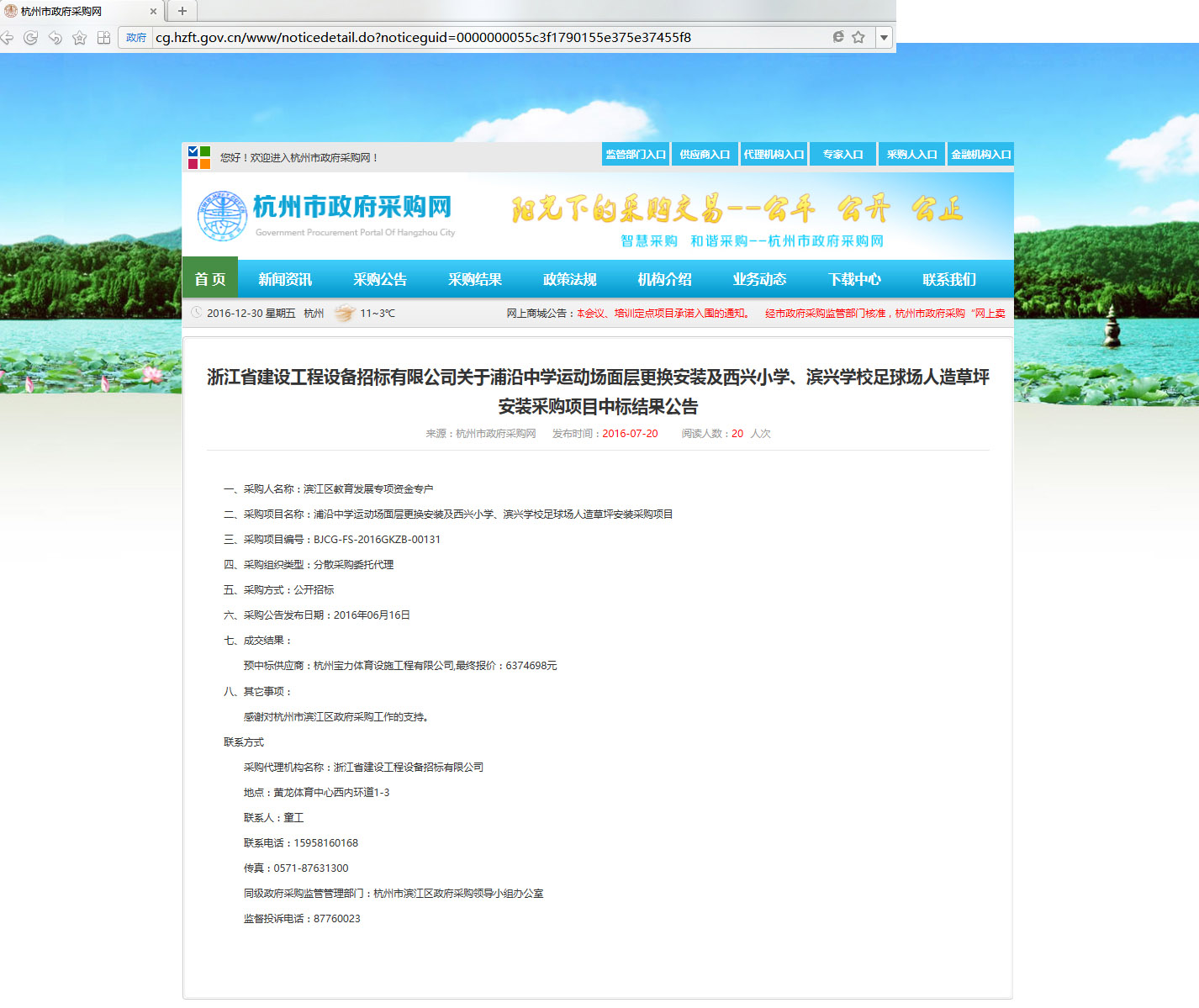杭州宝力体育中标杭州浦沿中学运动场面层更换安装及西兴小学、滨兴学校足球场人造草坪安装采购项目