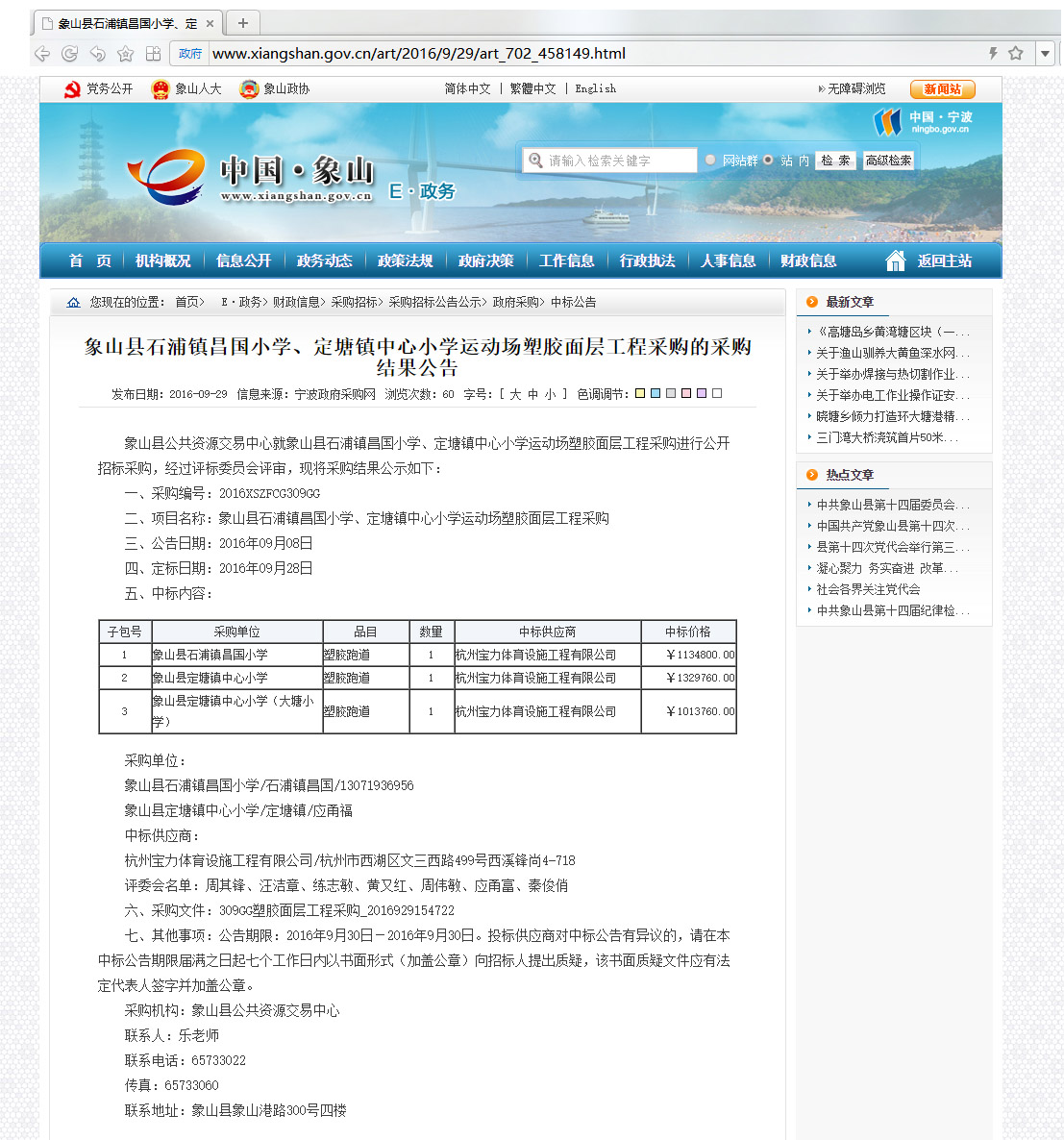 杭州宝力体育中标象山镇石浦镇昌国小学、定塘镇中心小学运动场塑胶面层工程