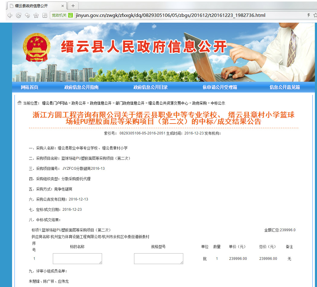 杭州宝力体育中标缙云县职业中等专业学校、缙云县章村小学篮球场硅PU塑胶面层等采购项目