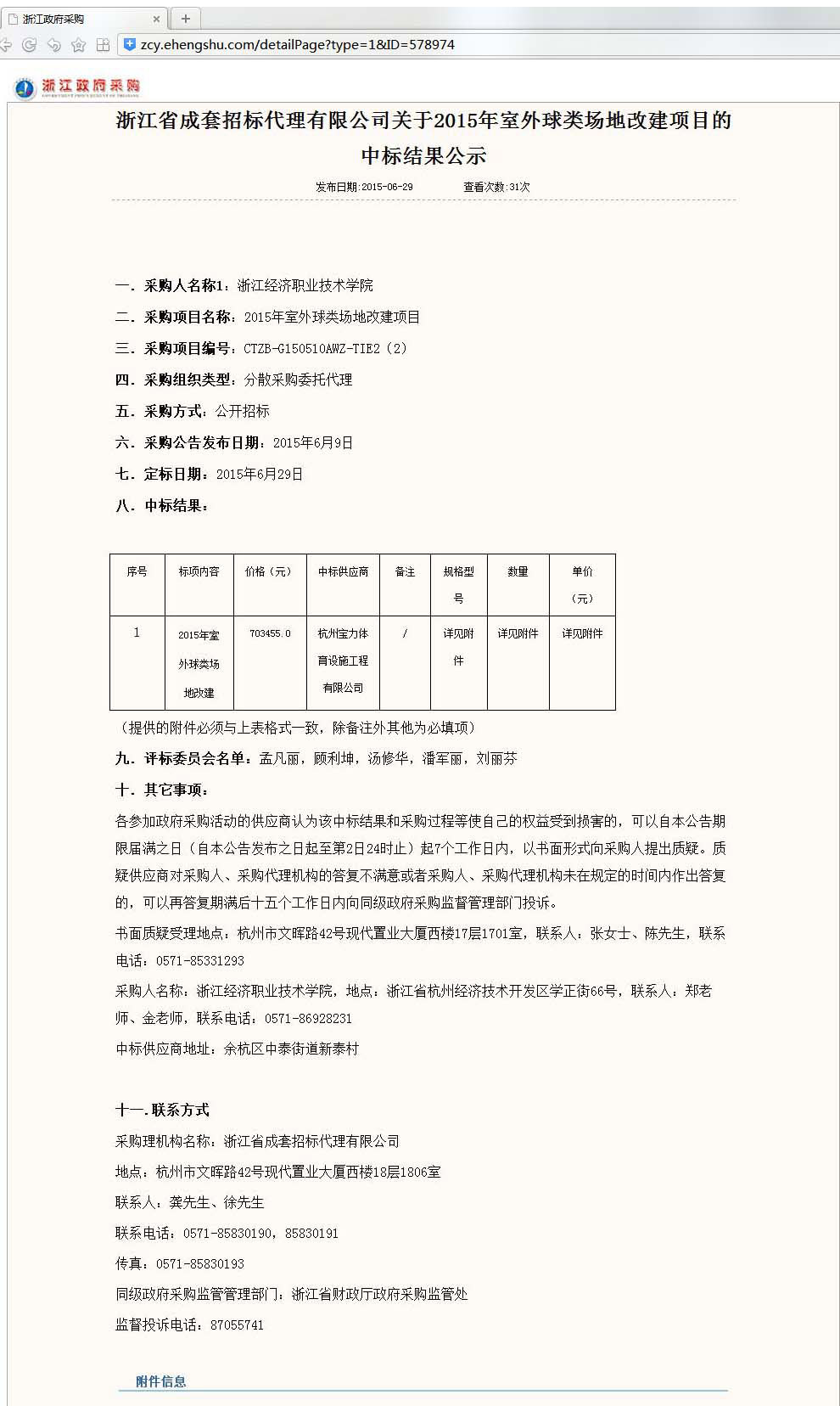 杭州宝力体育中标浙江经济职业技术学院2015年室外球类场地改建项目