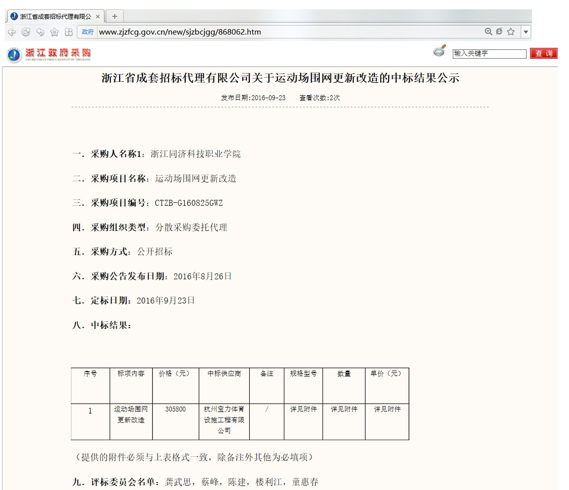 2016年9月23日中标浙江同济科技职业学院运动场围网更新改造工程