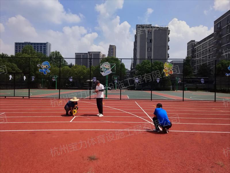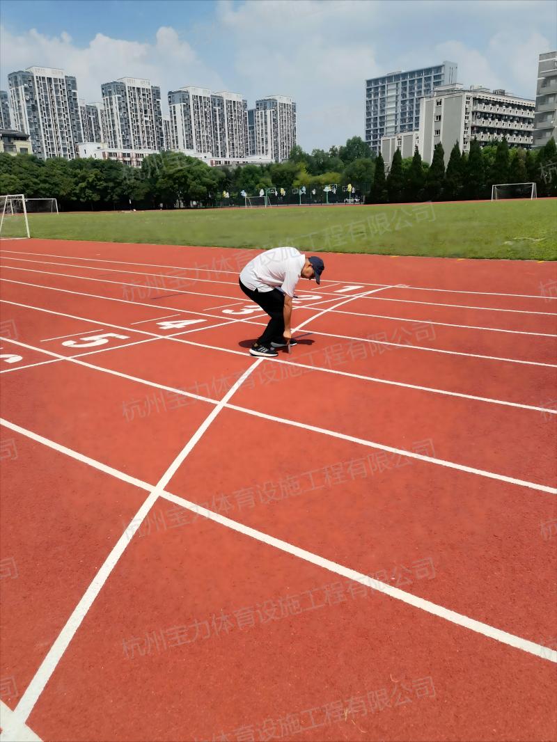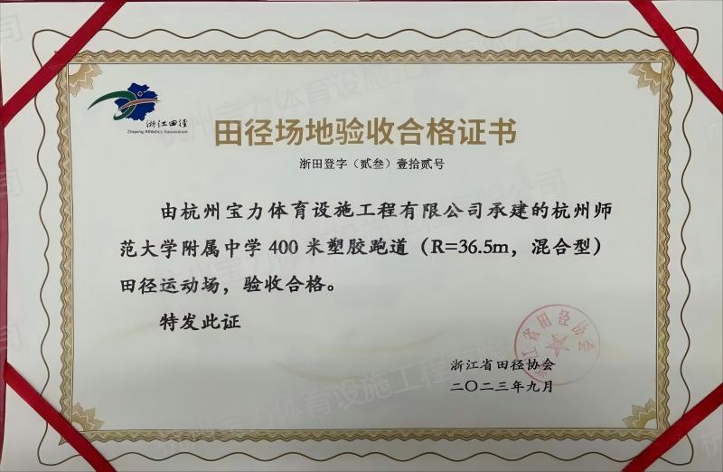 2023年由杭州宝力体育设施工程有限公司承建的杭州师范大学附属中学400米塑胶跑道(R=36.5m,混合型)田径运动场,经中国田径场协会验收合格。