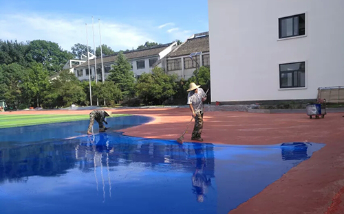 8月20日塑胶跑道施工批刮弹性层,播撒TPU颗粒
